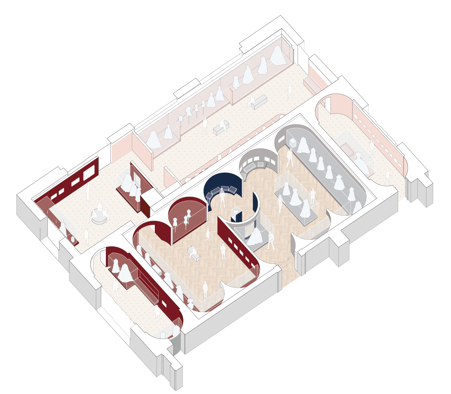 La scénographie s’appuie sur la volonté de donner à voir les costumes, robes, corsets et silhouettes sous différents points de vue, tout au long de la visite. Les espaces sont de dimensions agréables, positionnant chaque chapitre dans un espace généreux, aux limites architecturales clairement définies. La composition proposée dans le Salon d’honneur est directement issue de la composition architecturale du Palais Galliera. Elle permet de présenter le corset de Marie-Antoinette dans une salle à la forme singulière, en relation visuelle directe avec la grande robe introductive. La scénographie propose plusieurs dispositifs visuels de ce type, qui surprennent le visiteur et le maintiennent en éveil tout au long du parcours. L’entrée de la partie conclusive de l’exposition se réalise par une chicane.